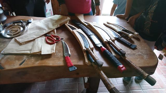 朋友請了在地導遊帶我們來趟深度旅遊,參觀的是銅門村歷史悠久的打鐵店。這裡產製的太魯閣族彎刀全都是手工打造,師傅說他早上四、五點就生火打鐵,約莫八九點就已經熱到不行只能熄火。每天頂多只能做出三把刀。