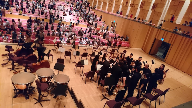 表演結束後,眾音樂家互相感謝道別,這一幕也是我從未見過的畫面。話說回來,坐在這位置有個好處:譜架看得太清楚!演奏曲目都會有樂譜,那麼安可曲呢?當然也有。當演奏完最後一首表定曲目時,我瞥見大部分團員的譜架上還有一小張白色的樂譜,後來進入安可曲時,有那白色樂譜的團員就繼續演奏,沒有的人則完全沒有再吹奏過手上樂器。所以,大多數的安可曲都是事先安排好的~第一次親眼見證。XD