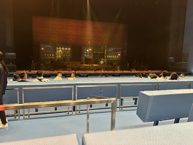 上面就是4樓A2區12排24號座位的視野。真的如我所預測,並不會太偏,而且高度也適中,不必特地仰頭看。此外,這場售票的情形沒有很好,所以高價區並未坐滿。如此一來,適巧讓我可以好好觀察這場地,我發現在舞池前方共有五個小螢幕,提供字幕供前排觀眾閱讀。除此之外,在左右兩側的牆上,各有兩個螢幕,這兩個螢幕我猜想應該有比正前方的小螢幕尺寸大些,但我仍舊覺得不夠大,在我後方的觀眾若是想看清楚,只怕還是很吃力。